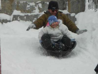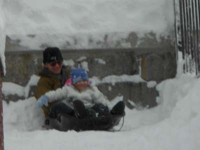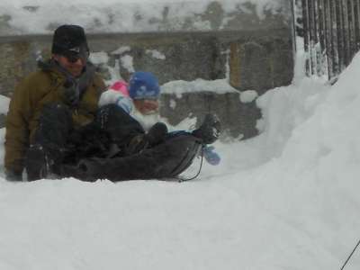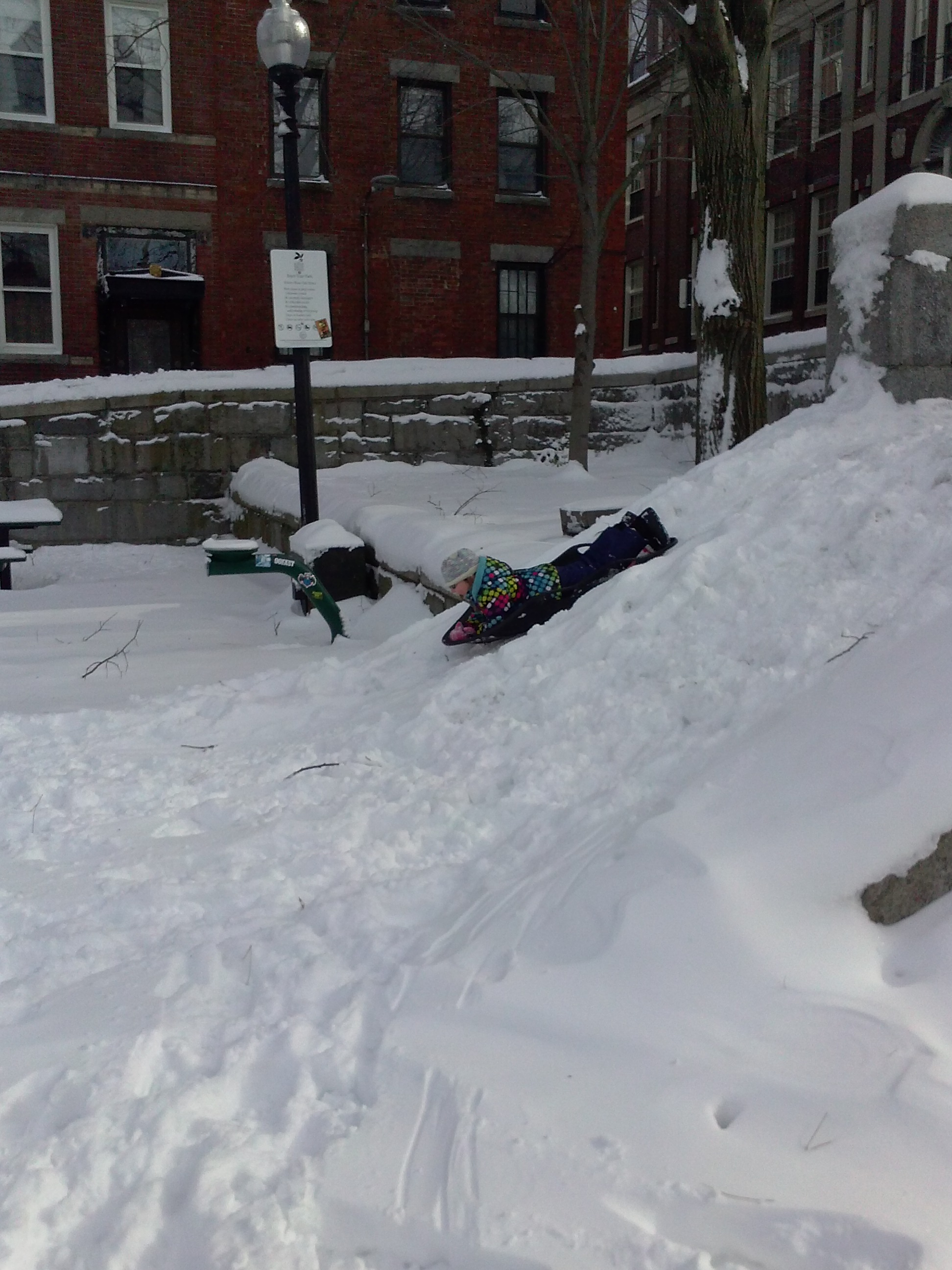 We played in the snow until we got too cold and then it was back home for hot chocolate and eggs. Once we warmed up and our clothes were dry, we grabbed the sleds to go sledding down the stairs at the Gassy Playground on Prince Street. Sledding down stairs seems like one of those things you only do in places like Downtown Boston.